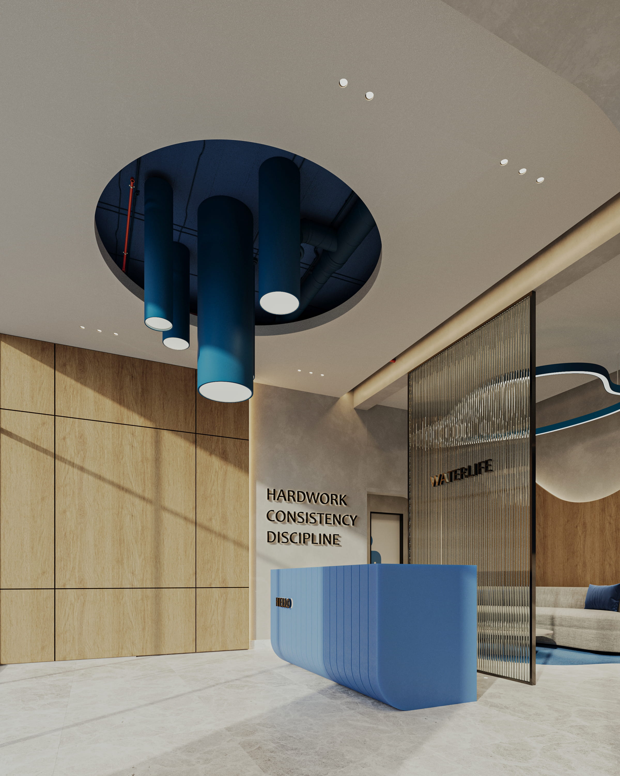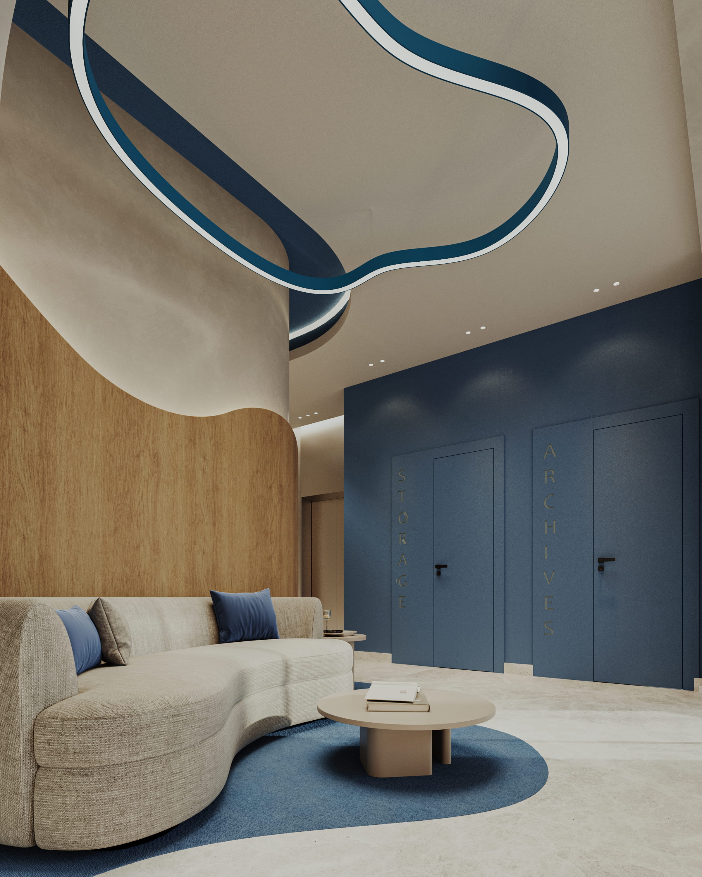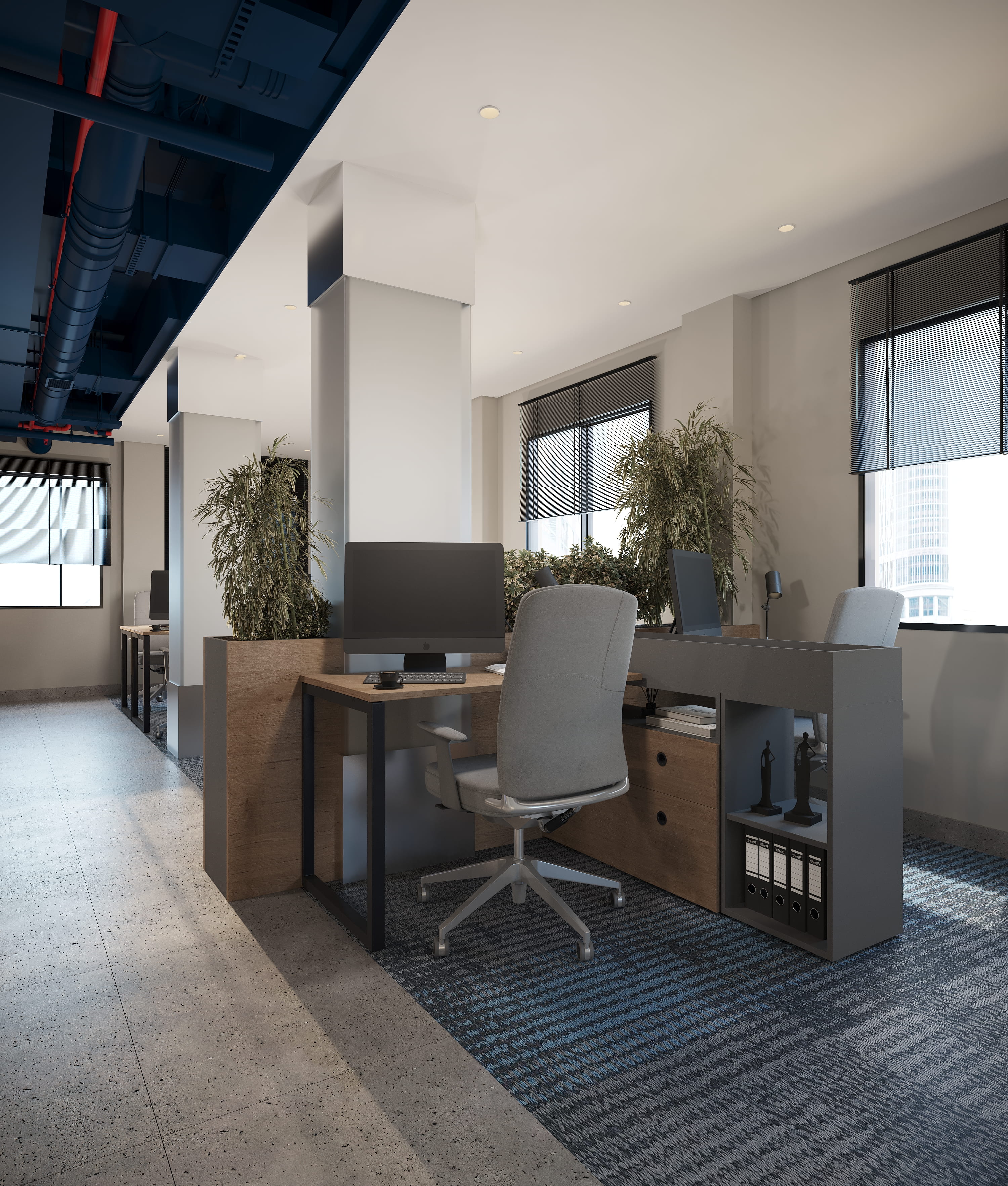 The interior design follows a contemporary and minimal language that complements the architectural facade, using clean lines, neutral materials, and functional layouts to create a calm and efficient working environment.