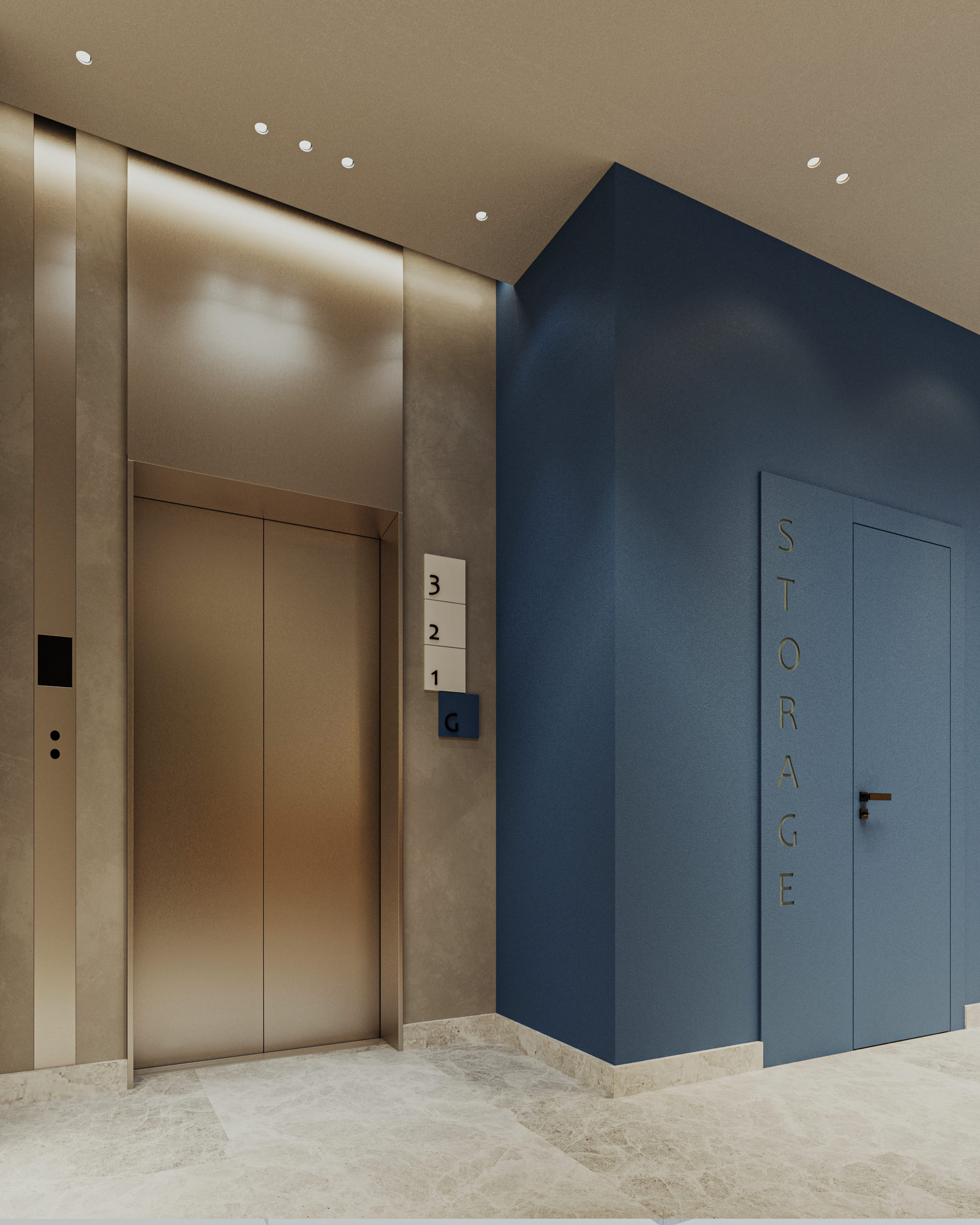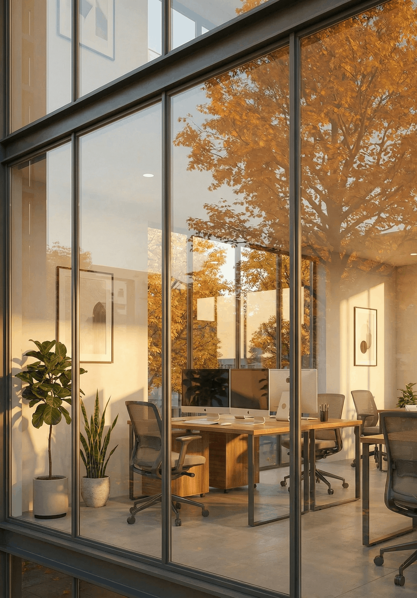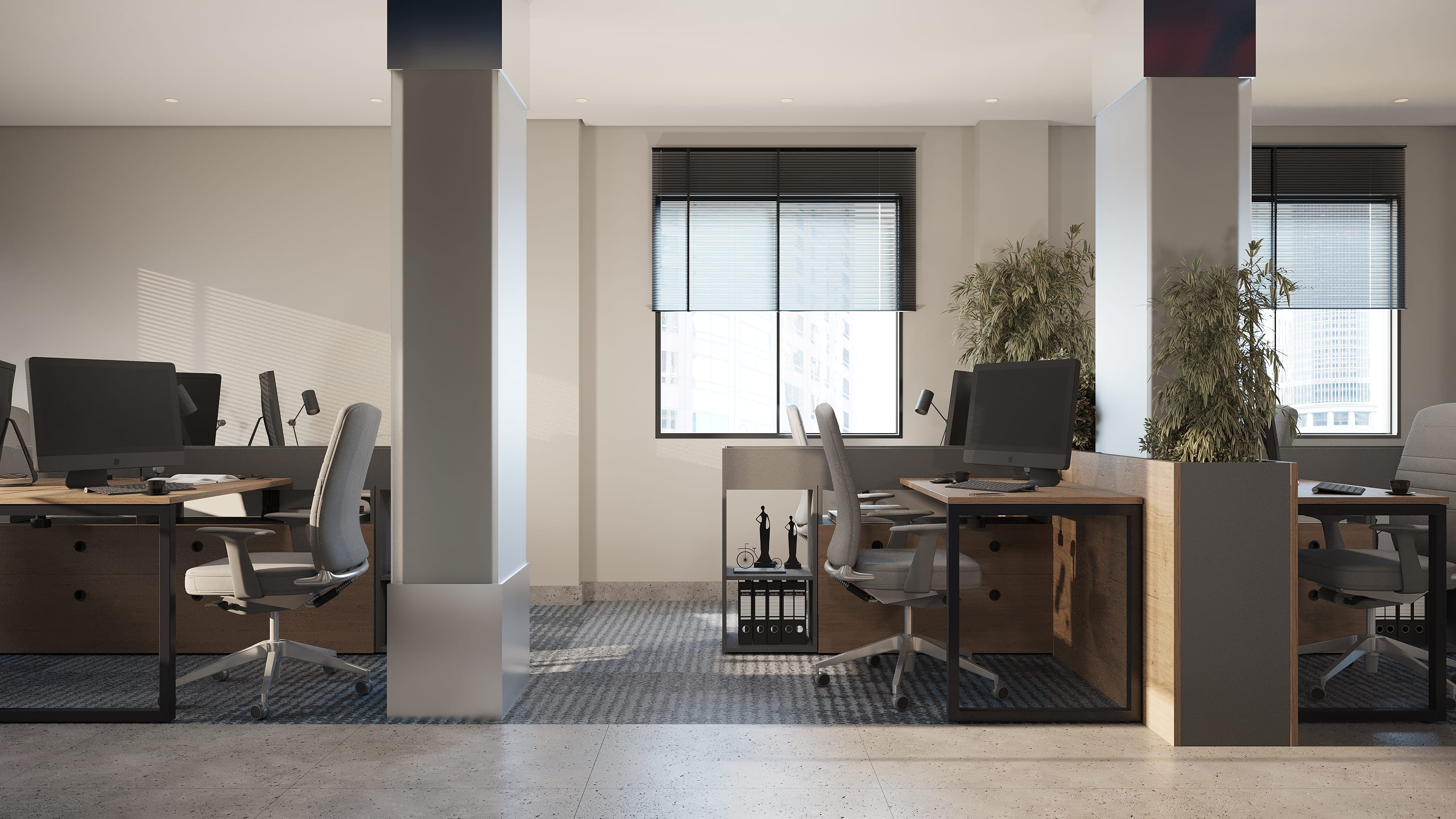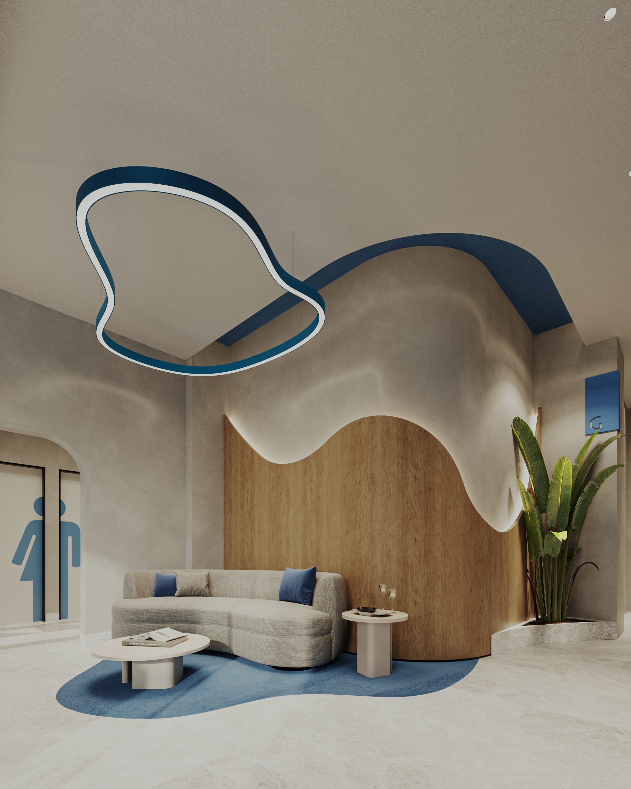 The interior design follows a contemporary and minimal language that complements the architectural facade, using clean lines, neutral materials, and functional layouts to create a calm and efficient working environment.