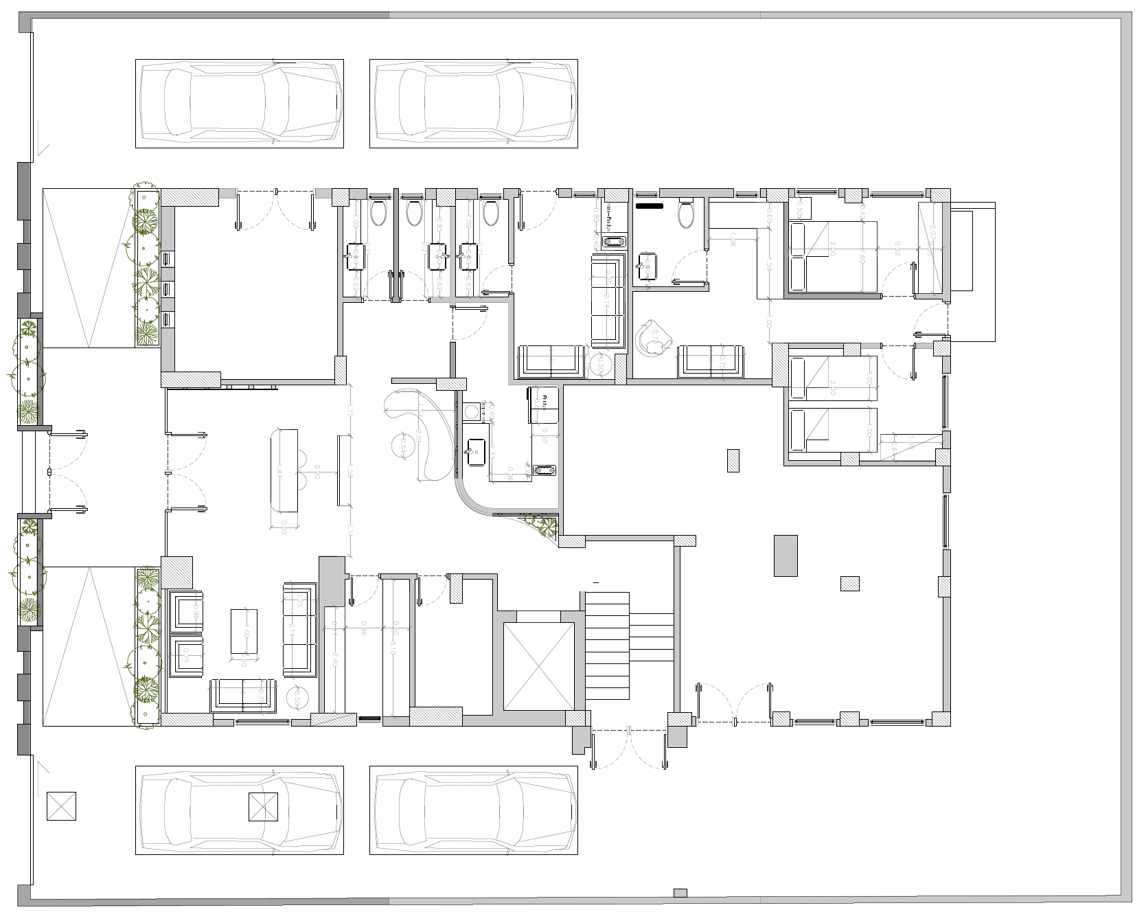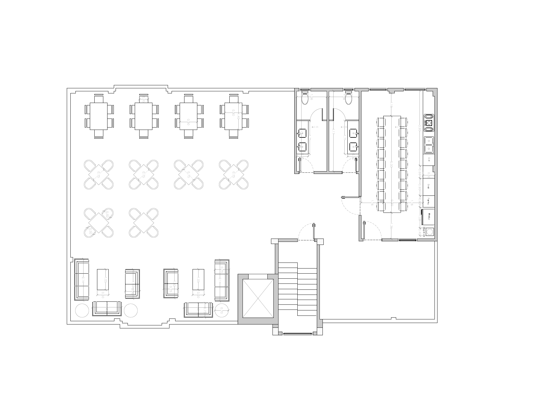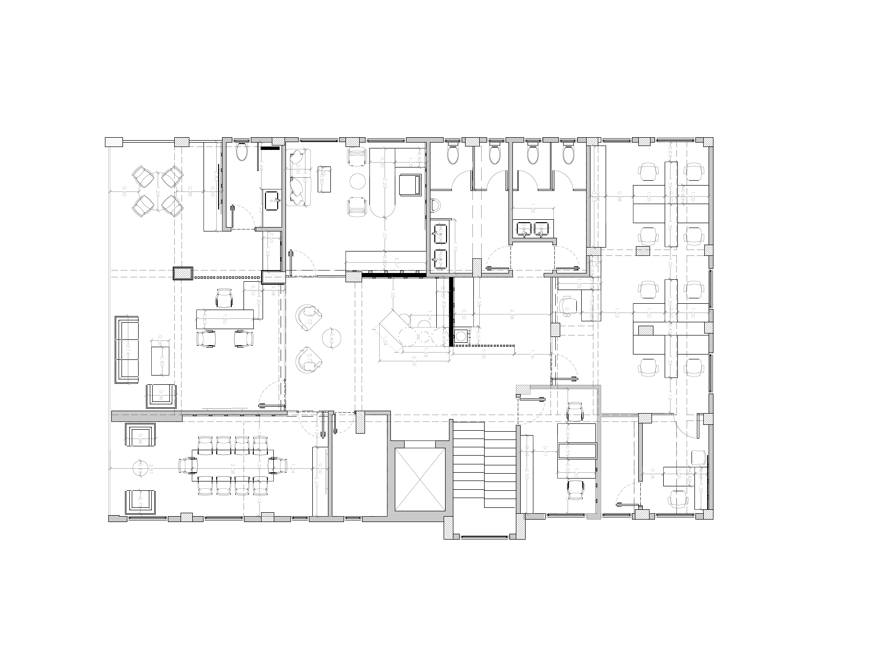 Internally, the building was redesigned to improve circulation, workspace functionality, and spatial clarity. The layout includes administrative offices, meeting rooms, open workspaces, and service areas organized around clear circulation zones to enhance workflow and user experience.