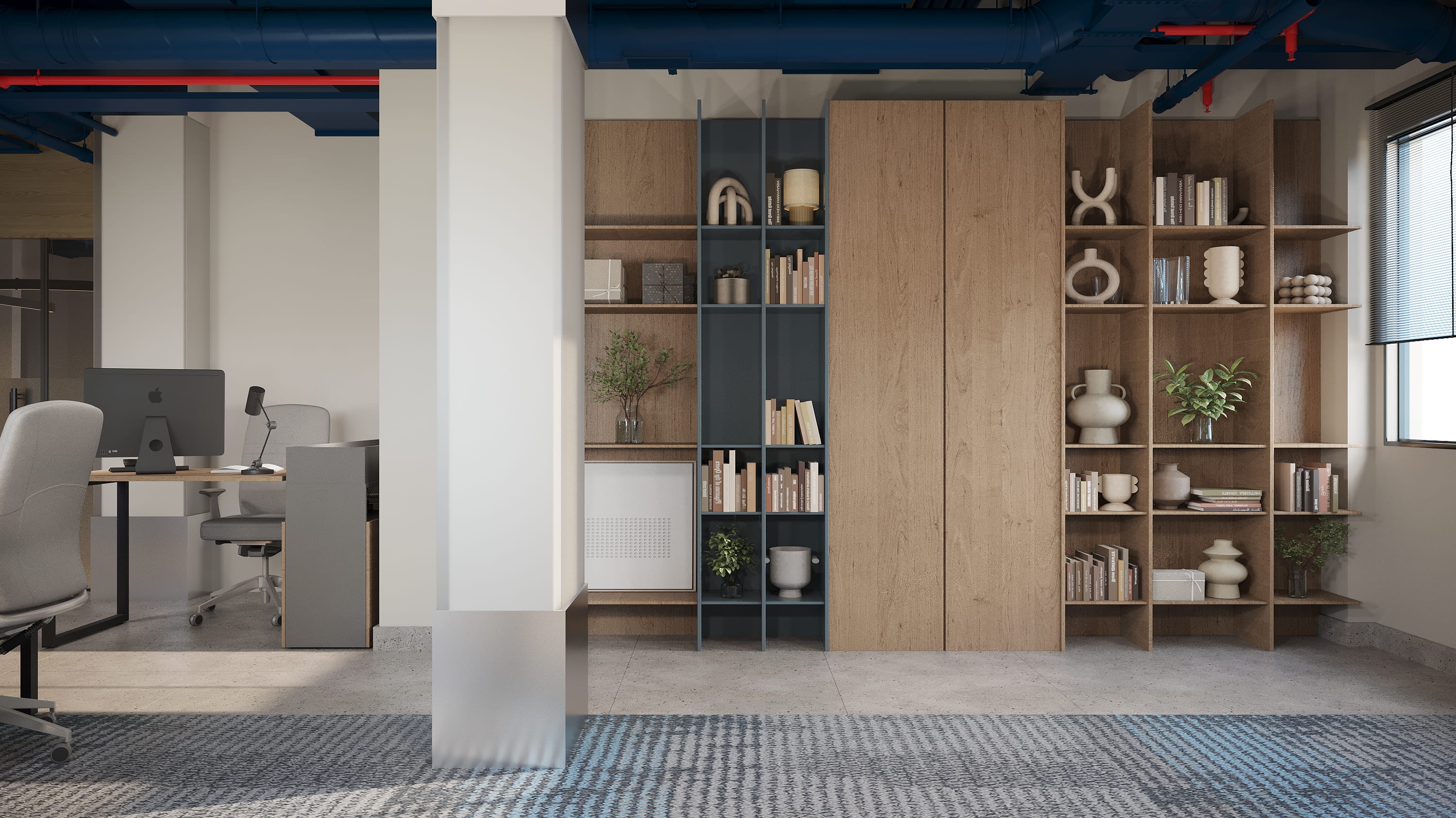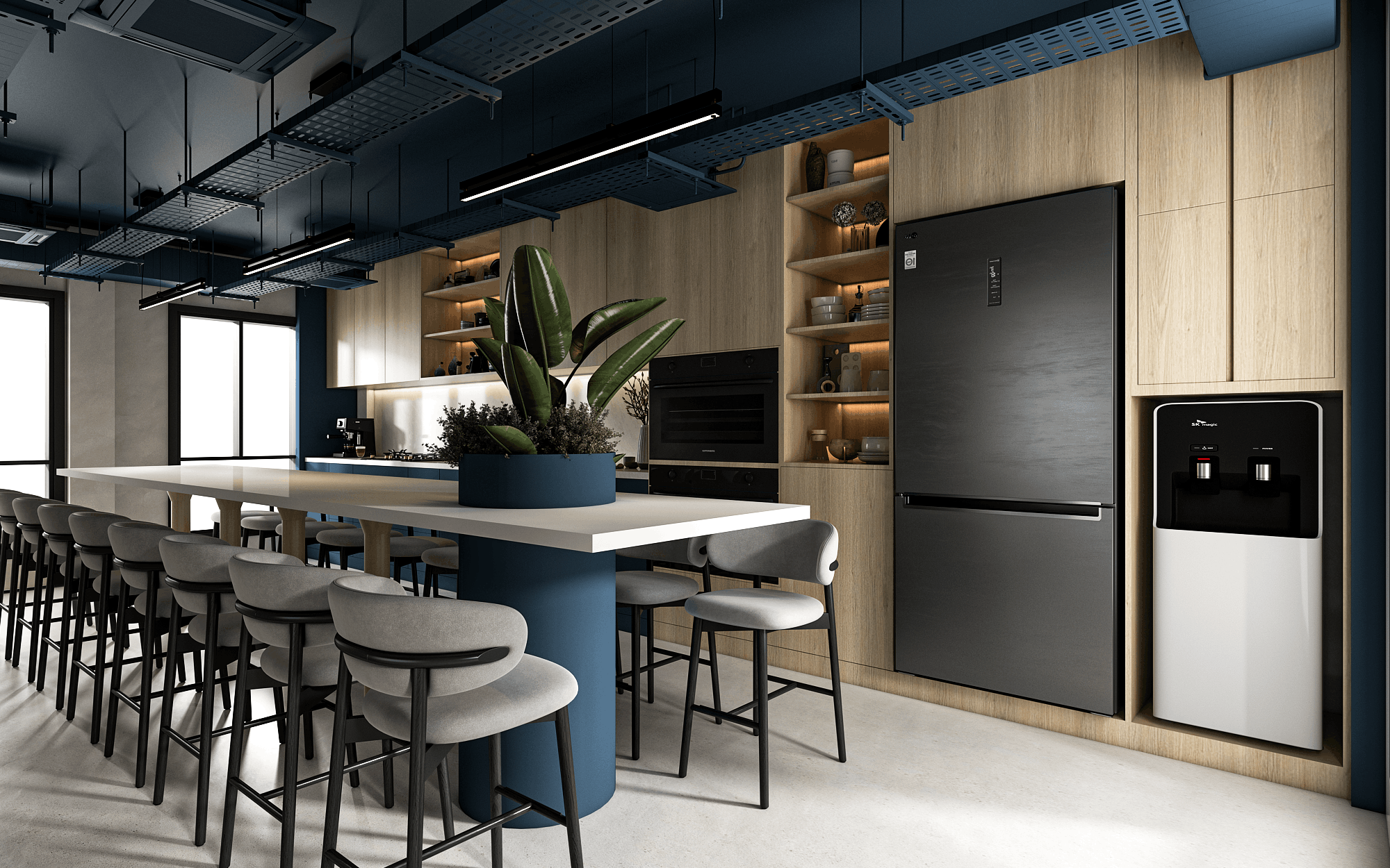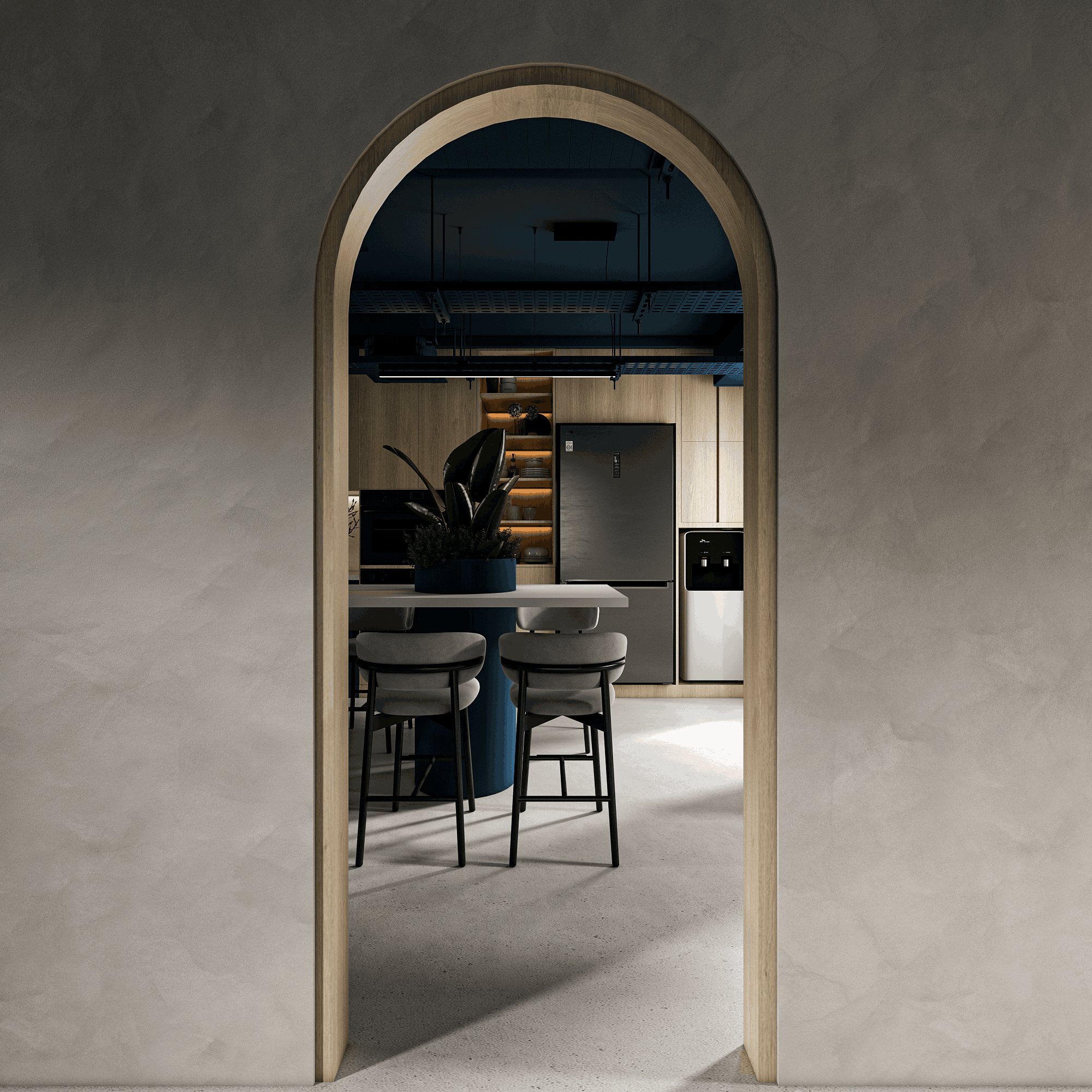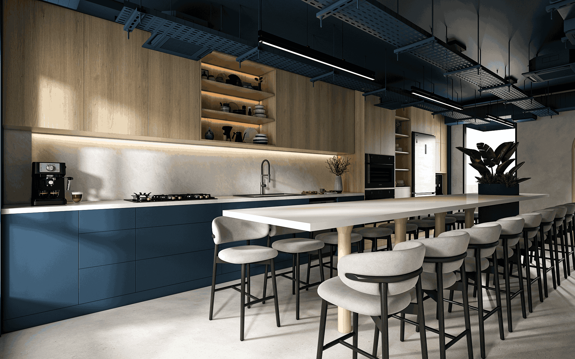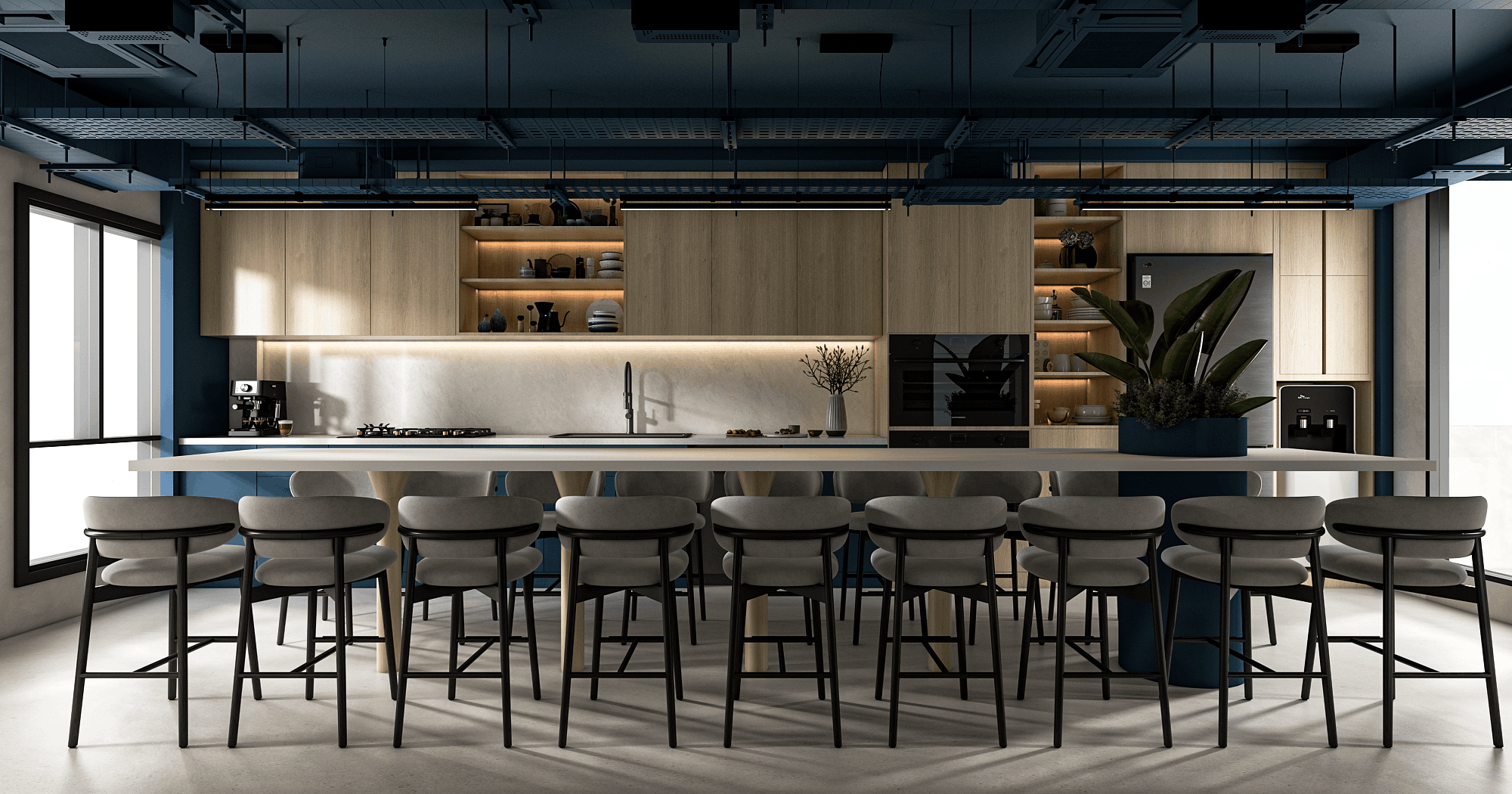The staff kitchen was designed as a shared space that encourages employees to gather and start the day together. The client’s main requirement was to create a common breakfast area that promotes interaction and a sense of community within the workplace. The space was designed to feel warm and welcoming rather than purely functional, using simple materials, clean lines, and a layout that allows multiple users to comfortably occupy the space at the same tim